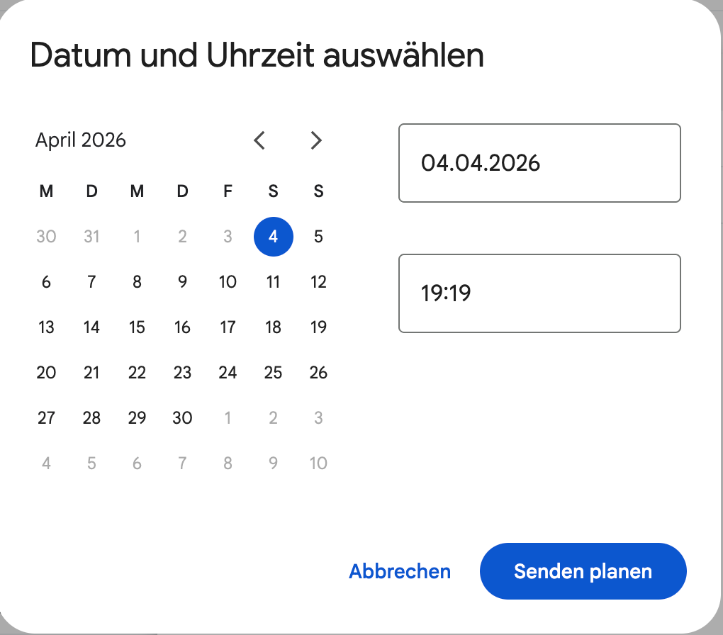 „Gmail schlägt dir sogar automatisch günstige Zeiten vor. Oder du wählst selbst: Klick auf Datum und Uhrzeit auswählen."