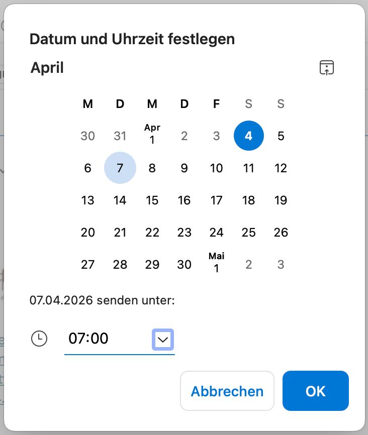Kalender-Auswahl: nächster Dienstag, 07:00 Uhr einstellen. Klick auf »Zeitversetzt senden«.